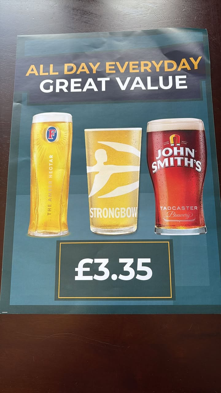 Good morning all! Not sure what the weather is like up there but here in Burton on Trent it’s gorgeous 🌞 I’ve some exciting news and some not so exciting news for you today…… Some beer prices are going down…….YES DOWN! Some sadly are going up, so below is our new prices as of today…… Fosters, John Smiths and Strongbow Original are going down to £3.35 🍺😮 Guinness is going DOWN to £5.20 a pint 🍺 All other lagers and ciders are going up by 5p I’m afraid 😩 But you know you’re going to get a decent pint! So why not join us today for day two of the Cheltenham Festival with the first race at 13:20, have a flutter and good luck 🤞 🐴 And of course we have our weekly bingo on tonight too, the bonus ball starting amount is over £200 😮💷 Bingo is on from 8pm so get them dabbers ready! Maria & ‘Team Vic’ xx