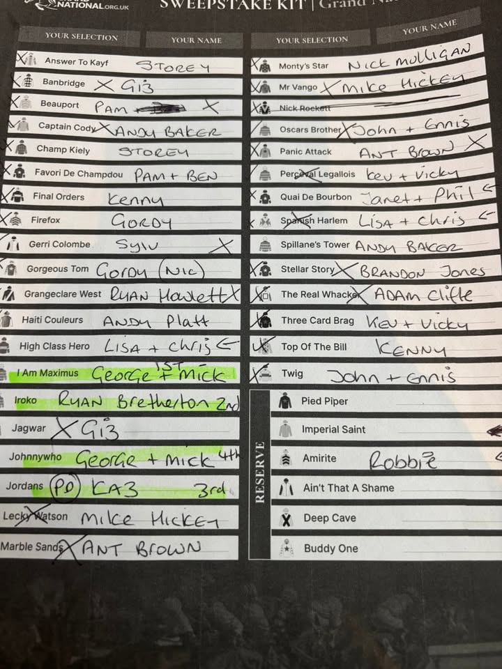 Grand National Sweepstake 1 I am Maximus ….George & Mick £80 Iroko……Ryan Bretherton £50 Jordans ……Kaz Whalley £30 Johnnywho…..George & Mick £10 Sweepstake 2 I am Maximus…..Sinead £80 Iroko…..Ellie Francis £50 Jordan’s…..Mark Lyon £30 Johhnywho……Callum £10 Well done all 👏👏🐴🐴